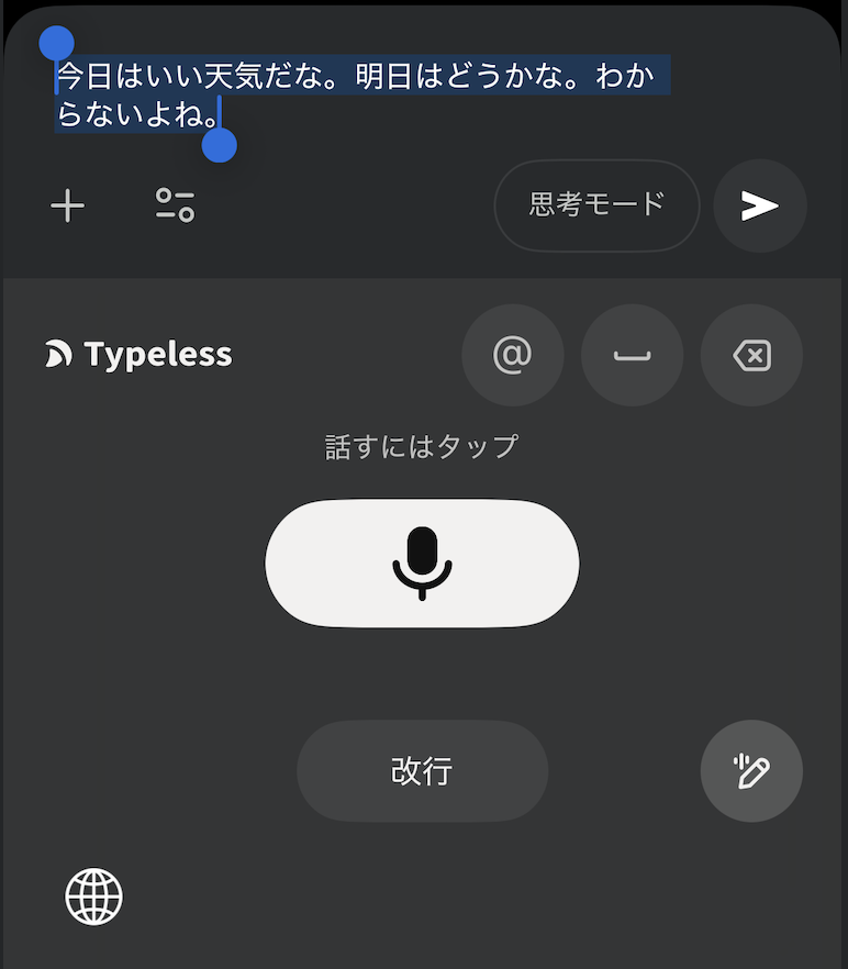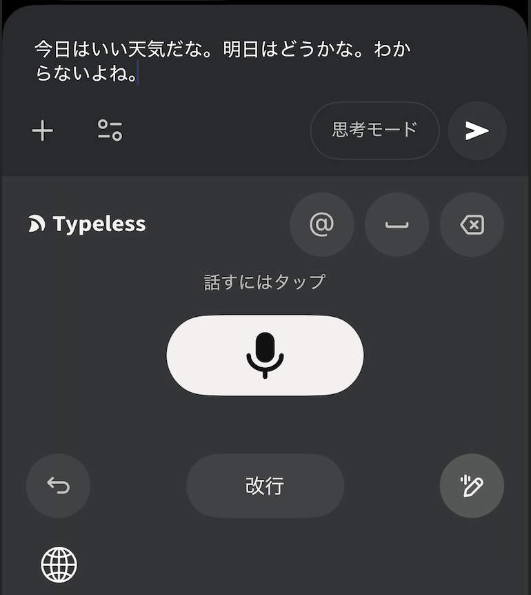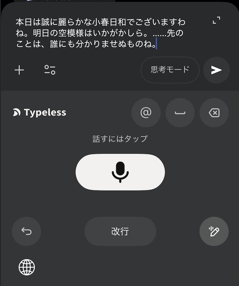 これだけで、メールの返信案やブログの骨子が完成します。ChatGPTにコピペする手間すら不要。すべてがTypelessの中で完結します。