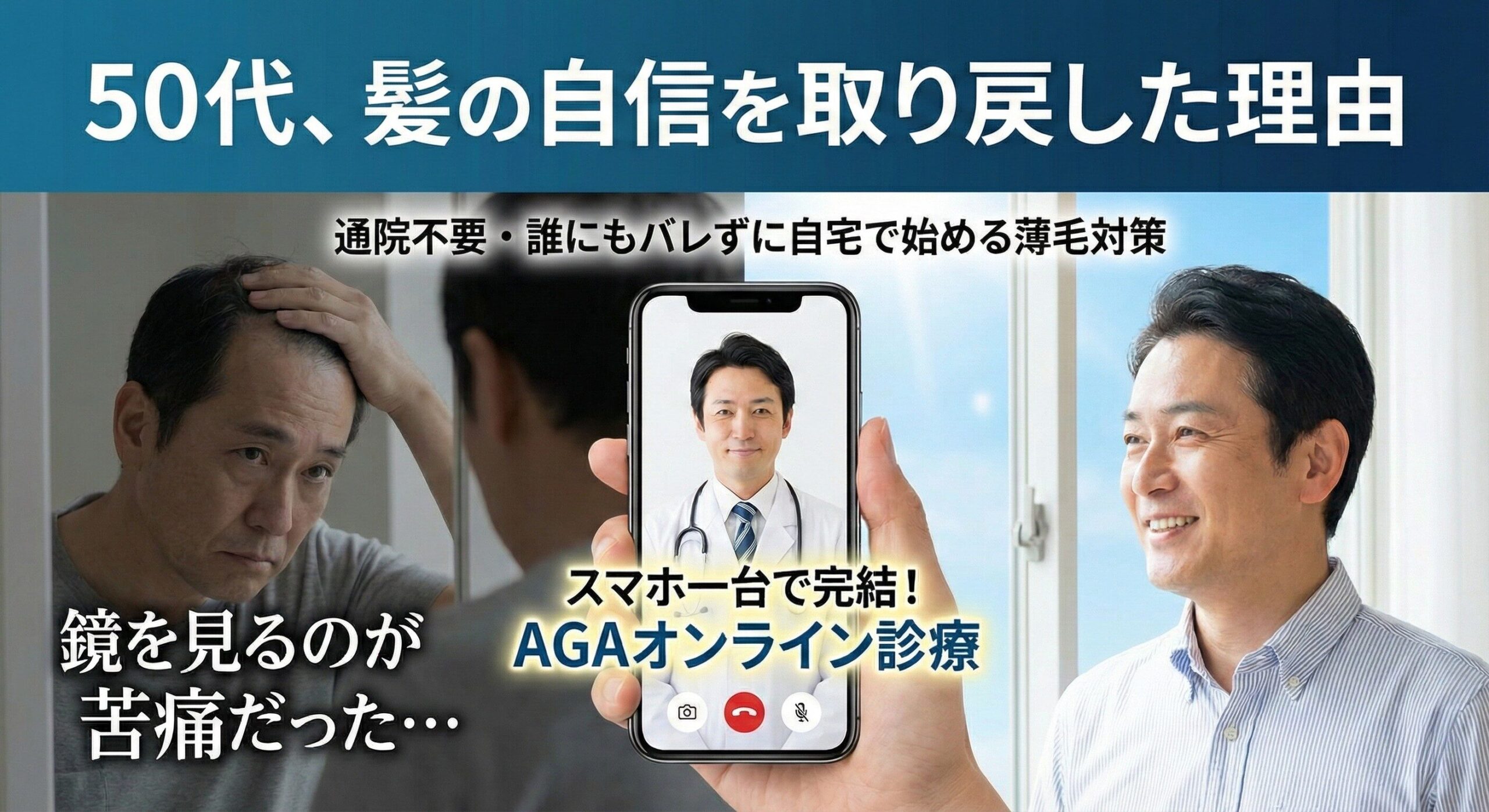 まずは結論からお伝えします。忙しく、プライバシーを重視したい40代以上の世代にとって、AGA治療はオンライン診療がもっとも効率的で継続しやすい選択肢です。